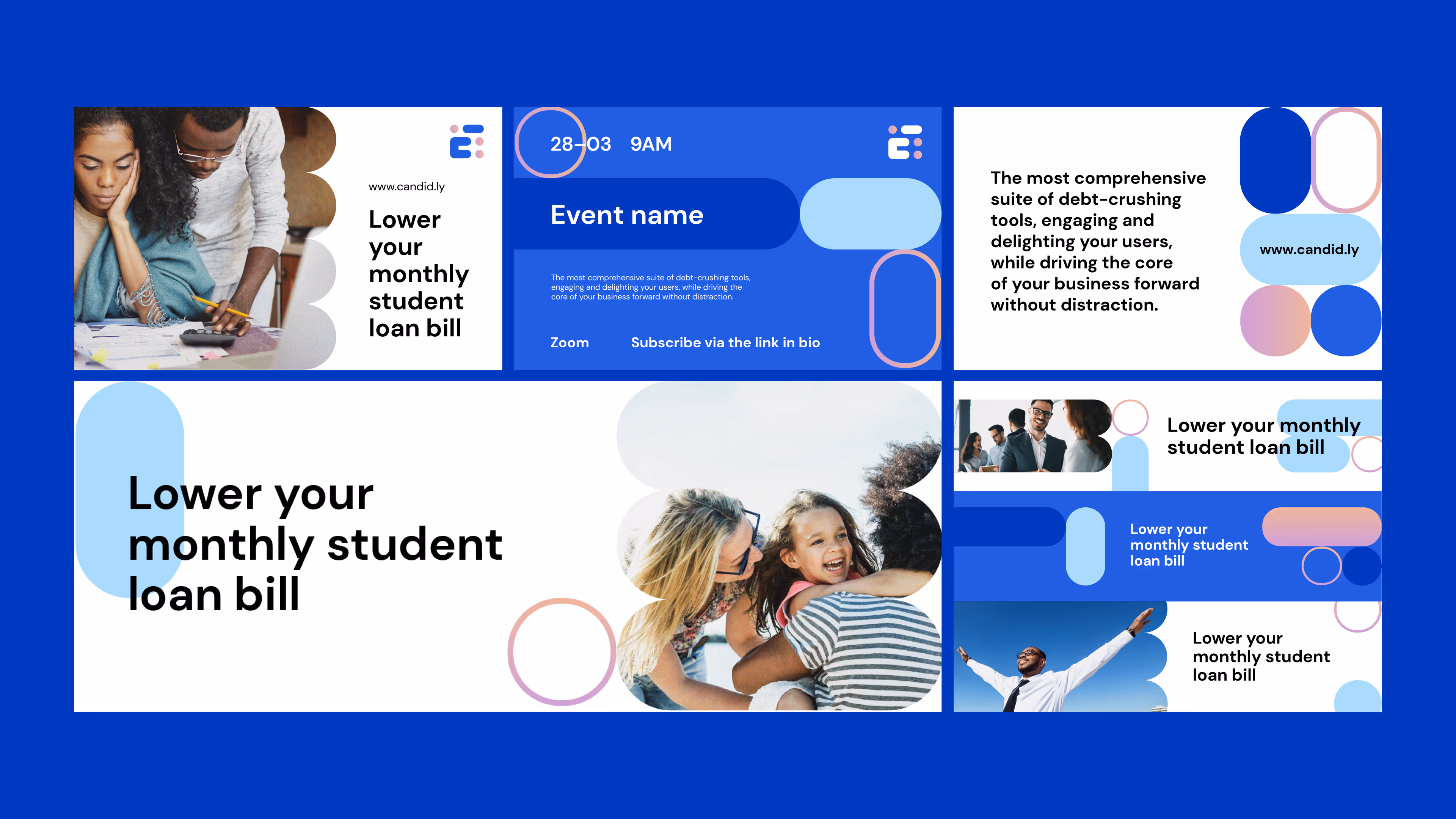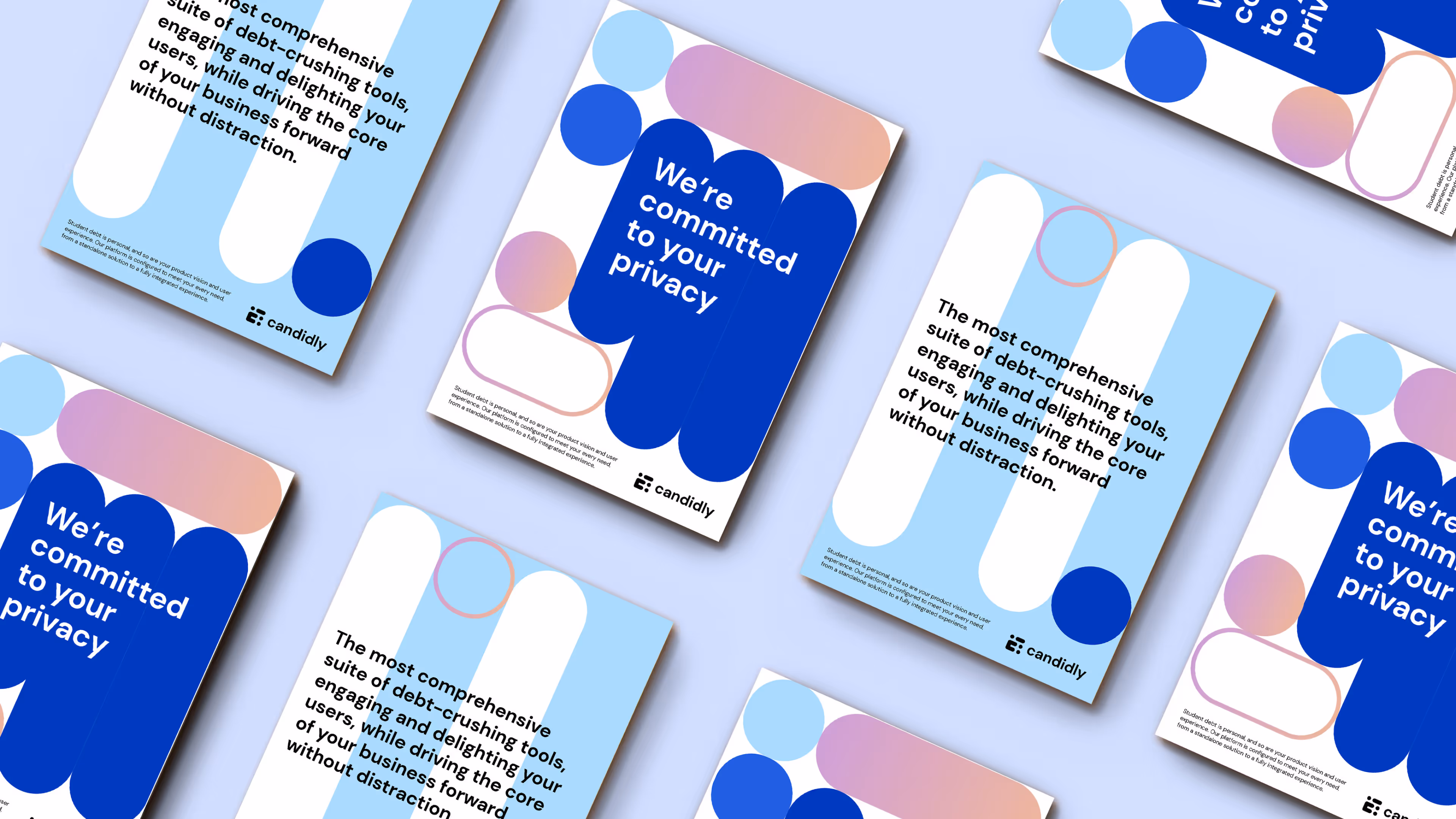 We built the brand around the idea of “creating new systems for managing existing assets.” A stylized "C" monogram and geometric content containers conveyed both structure and care, forming the foundation of a bold, cohesive identity. Custom illustrations and a unified visual language reinforced Candidly’s empathetic, human-centered approach to financial wellness.