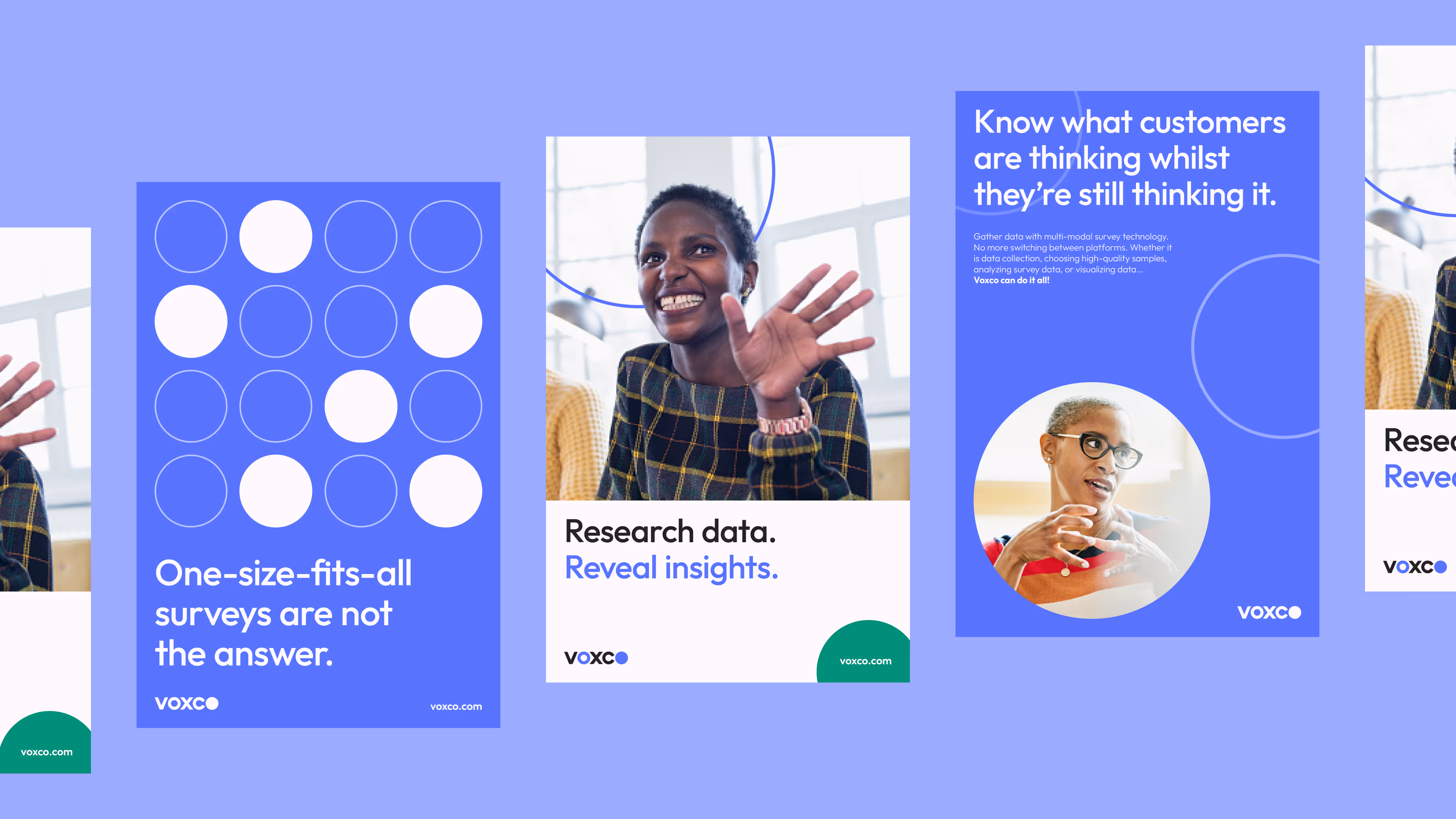 Human-centered tech brand: Inspired by the fold in Voxco’s logo, we introduced the concept of "reveal"—a nod to uncovering insights. This idea bridged their tech-driven strengths with a people-first narrative, reflecting the real value of research: human understanding.