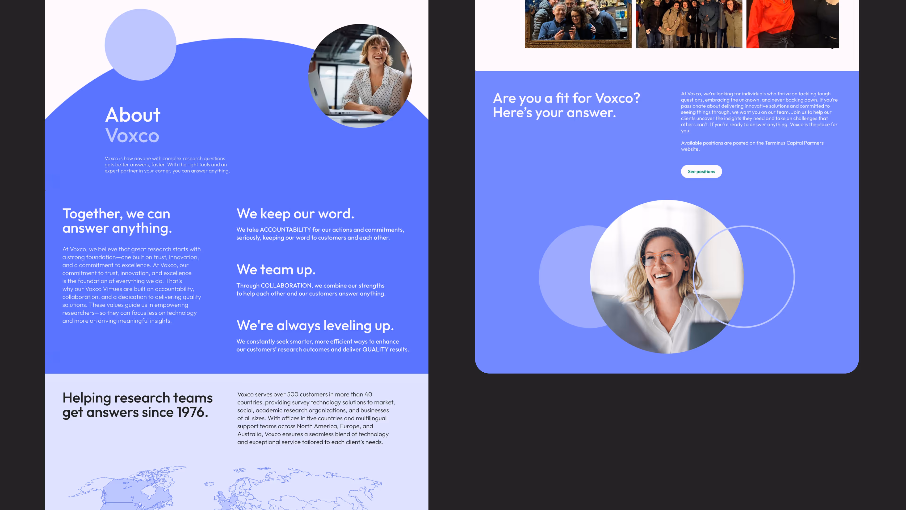 What began as routine website maintenance evolved into a full-scale, four-month brand and digital overhaul, delivered under a tight timeline. The project repositioned Voxco for its next stage of growth, honoring its 47-year legacy while signaling a clear focus on innovation. The new brand and platform reflect their identity as technology collaborators committed to advancing human-centered research.